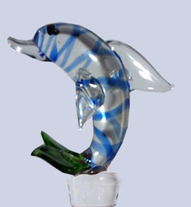 Hand Blown Glass Dolphin Wine Bottle Stopper. Bottle Stopper is handmade by a glass blower artist. No molds are used therefore no two are exactly alike. Colors will vary and bubbles may occur adding to the uniqueness of these hand sculpted and designed treasures.