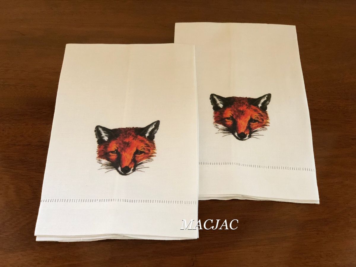 Set of two crisp white linen Fox Mask hemstitched eyelet border designed towels. This characteristic Fox face brims with beauty and self-confidence. Unfolded each towel measures approximately 14"W x 21.5" L. A perfect present for any occasion. Set of two towels shipped in white gift box.