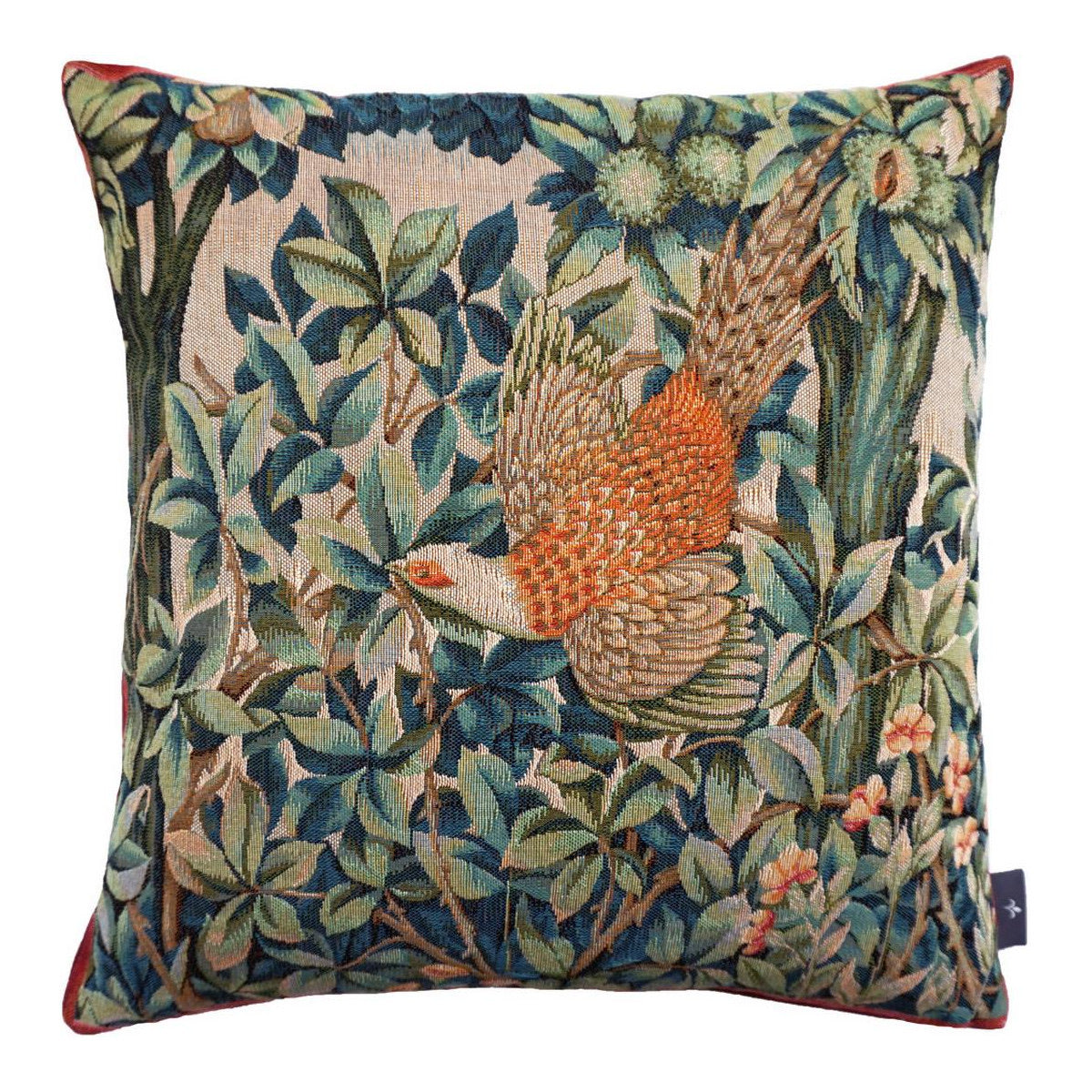 A Pheasant in the Forest Jacquard Tapestry Pillow. Pillow is inspired by the works of William Morris
