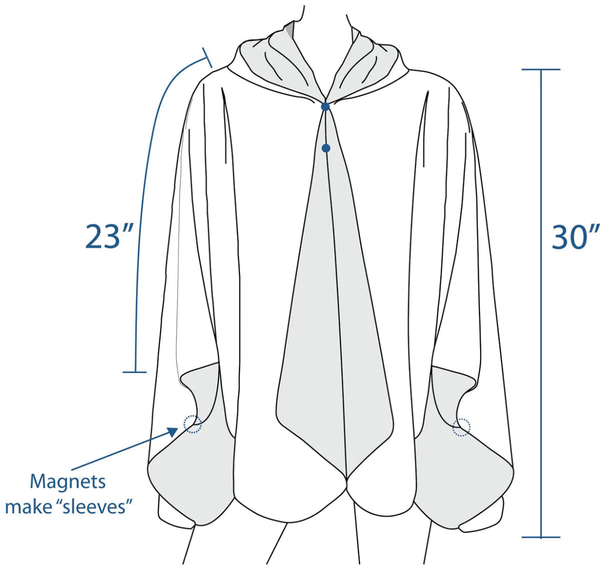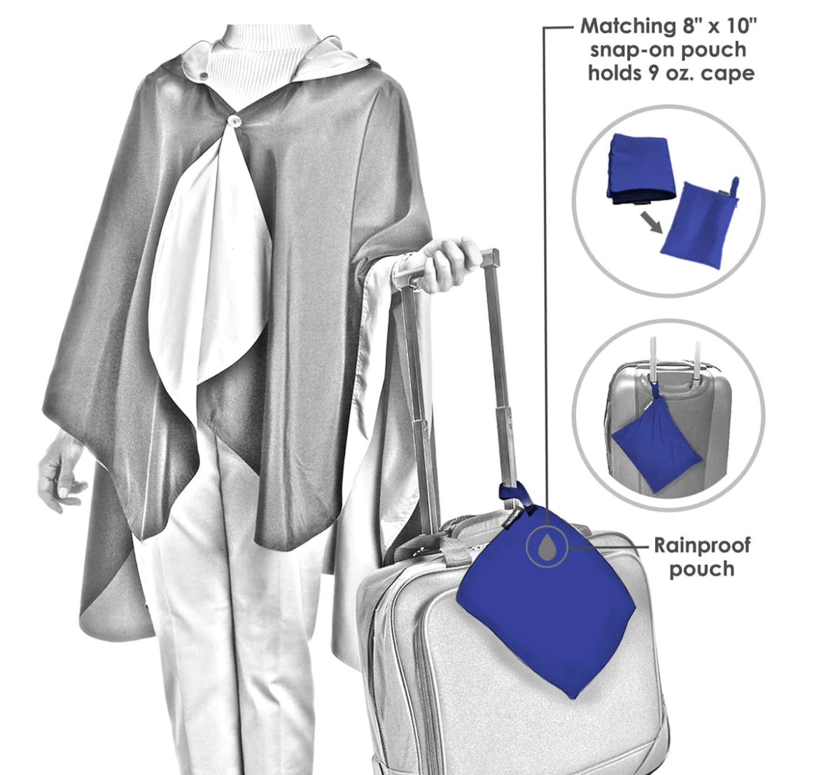 RainCaper waterproof poncho William Morris Bluebell on silky soft reversible blue fabric. Poncho features a two button front, hidden magnetic closures to create sleeves and reduce billowing, attached hood and zippered pouch with snap strap for easy attachment to purse or luggage.