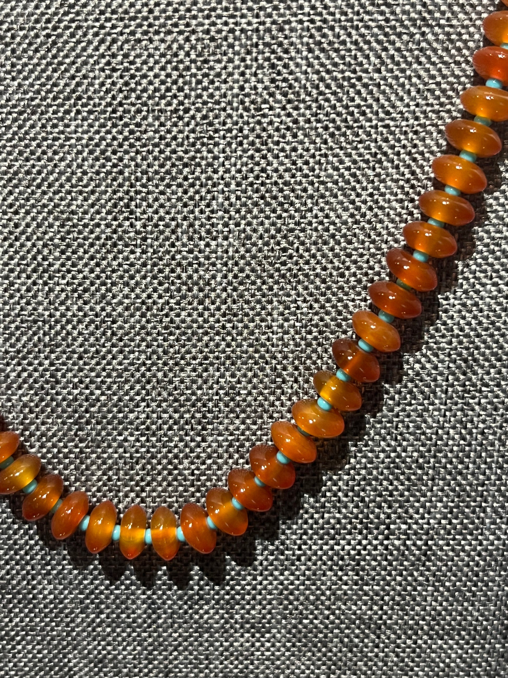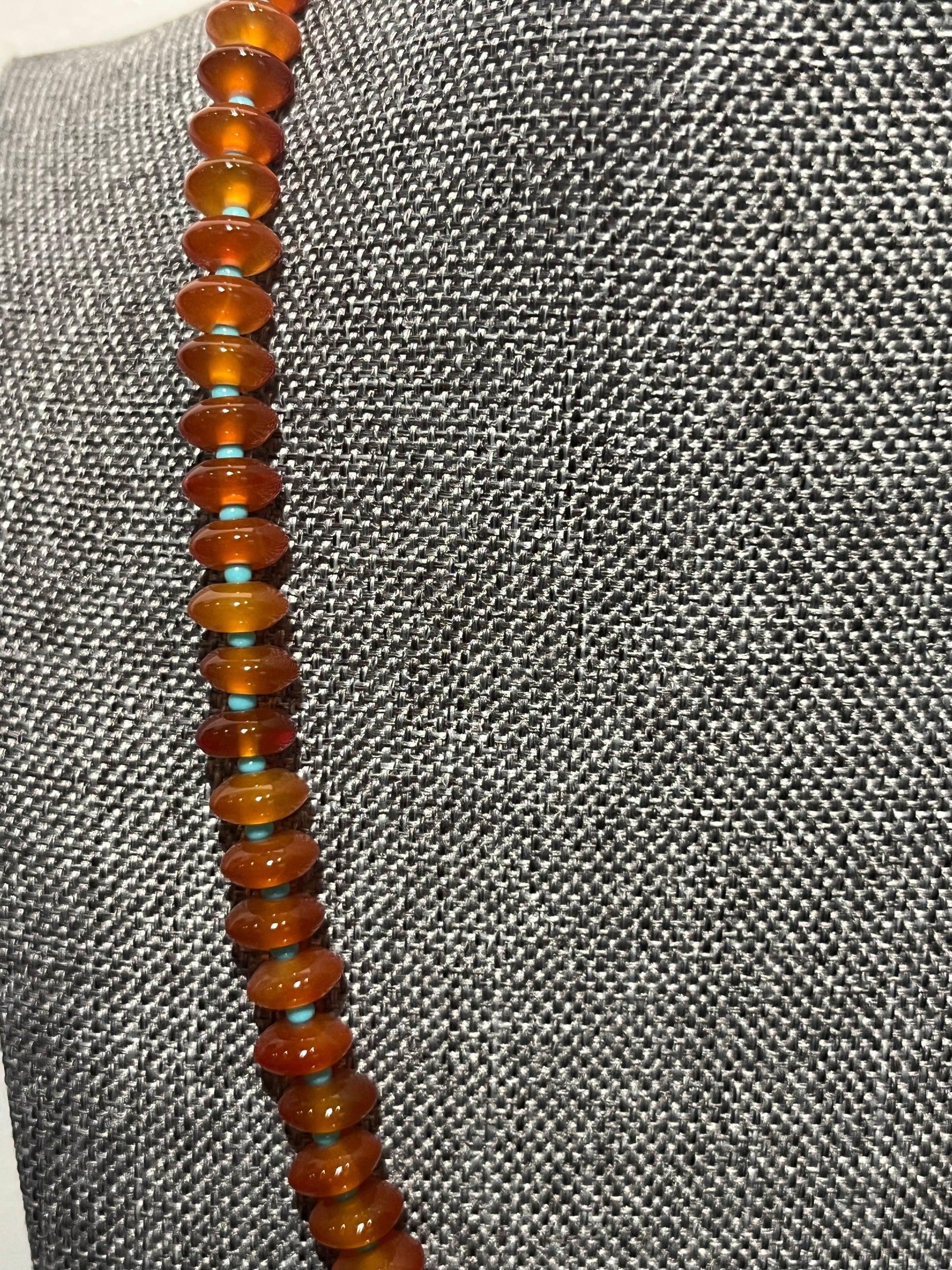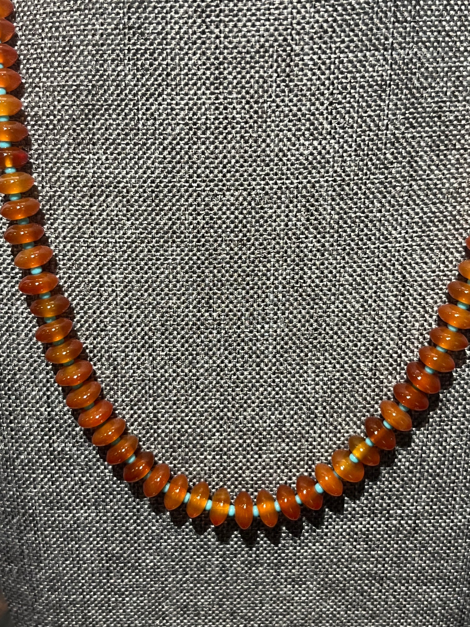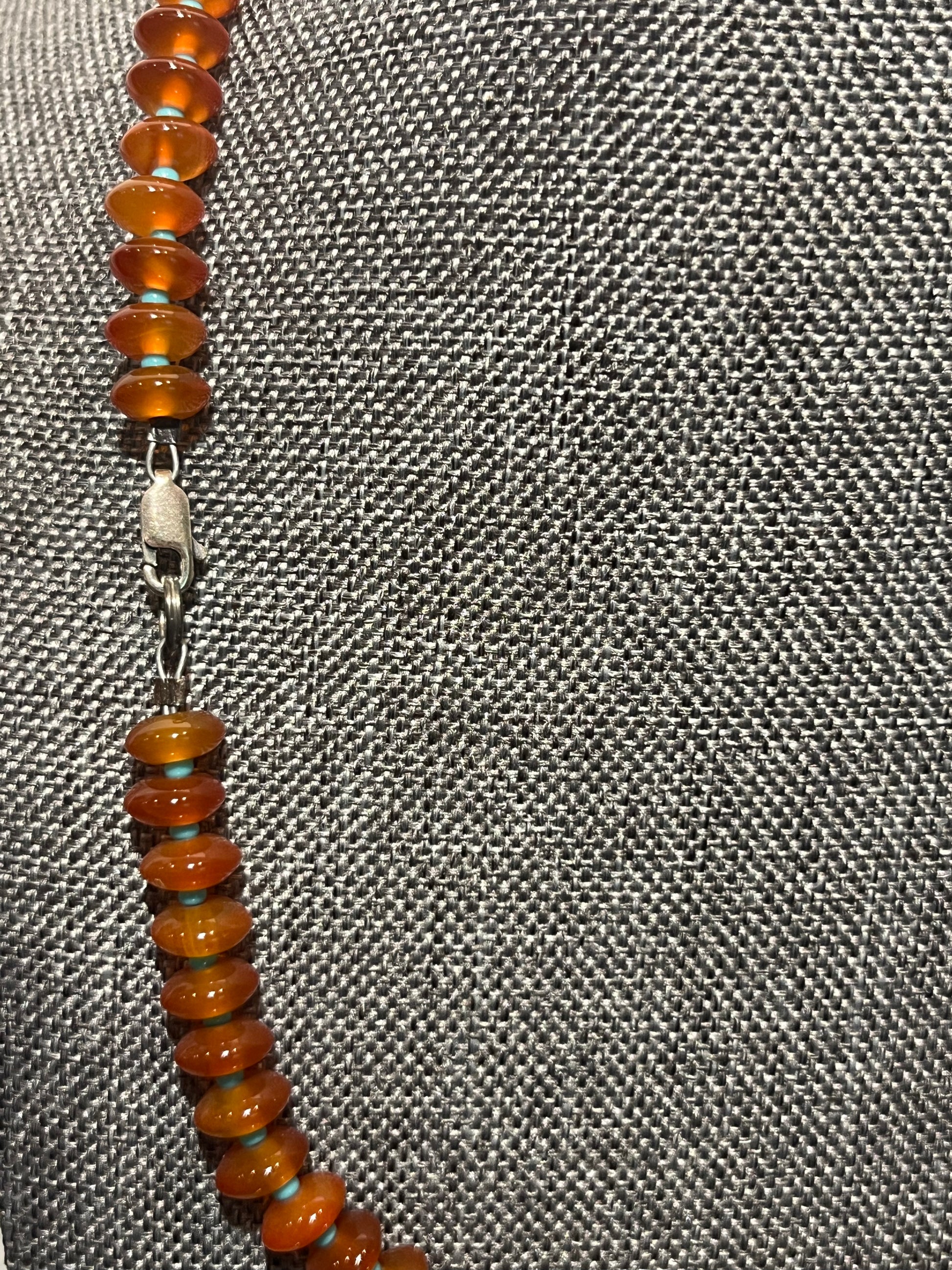 Carnelian and Turquoise Sterling silver necklace. Natural gemstones will have variations. Measures approximately 18 inches.