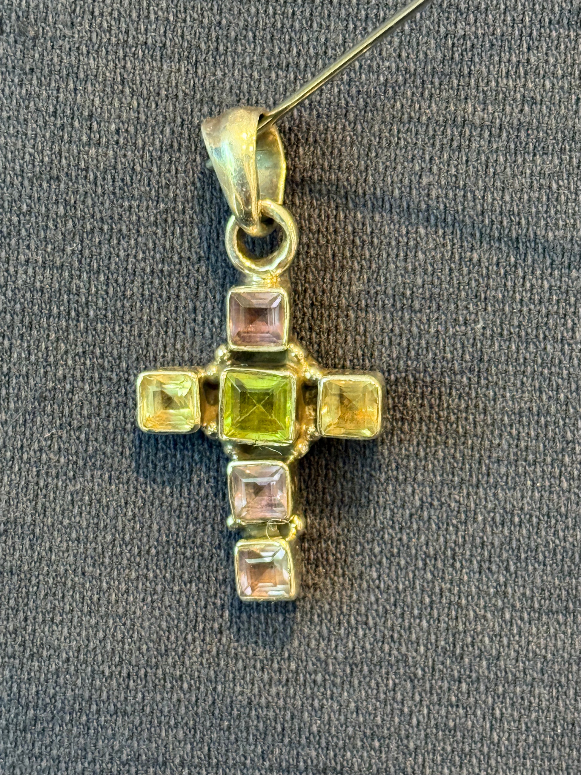 Citrine Amethyst And Peridot Sterling Silver Cross Pendant New. Natural gemstones will have variations.