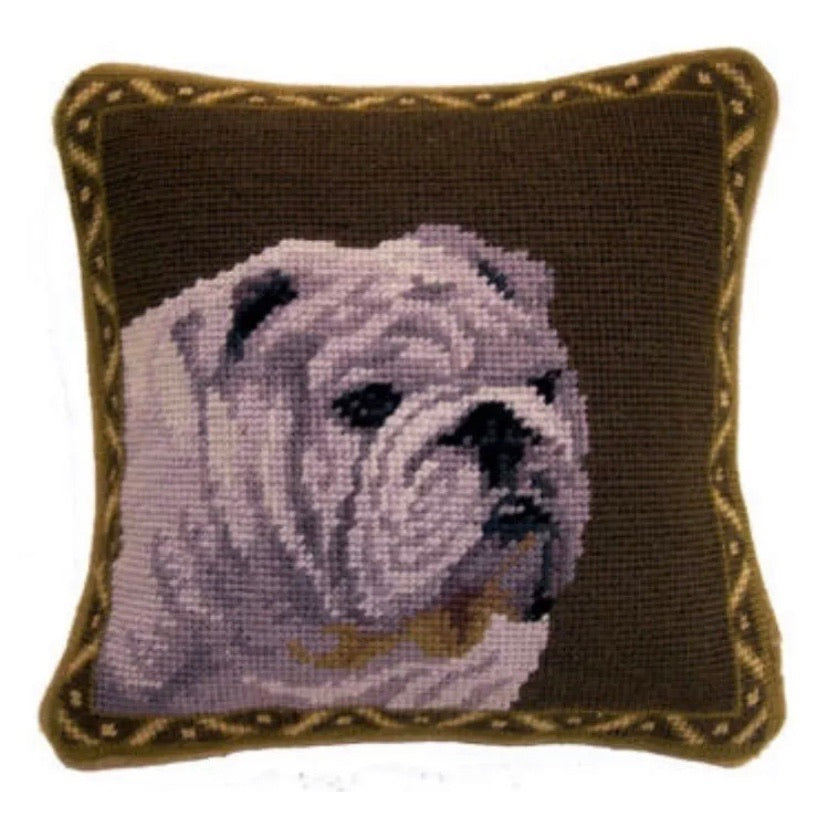 Bulldog Needlepoint Pillow. Hidden zipper on back of pillow for dry cleaning removal. The front of the pillow is 100% wool needlepoint and backed in camel velveteen. Each pillow is handstitched representing a timeless tradition.